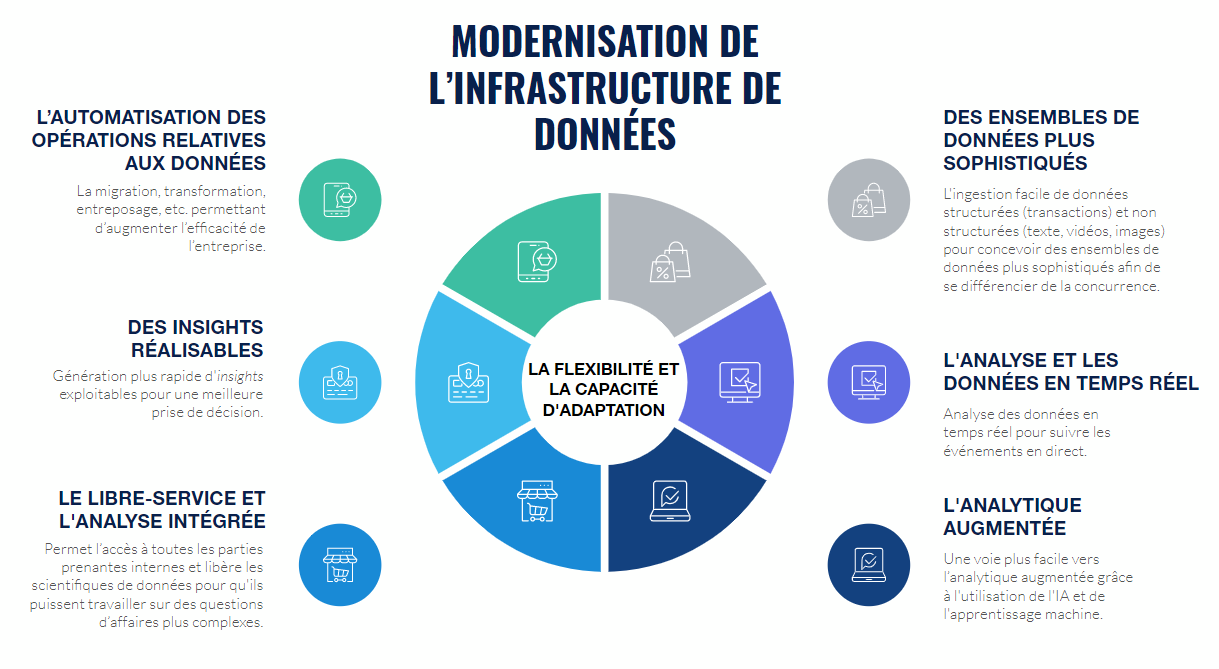 Avec l’explosion de l’offre de solutions infonuagiques (Amazon, Azure, Google), les termes « modernisation des données » (data modernization) et « modernisation de l’entreposage de données » (data warehouse modernization) sont fréquemment utilisés pour désigner la migration de systèmes informatiques traditionnels (sur place) vers des systèmes informatiques en nuage (sur le cloud). Évidemment, la technologie est un élément crucial de la transformation numérique, et l’informatique en nuage (cloud computing) fait partie des technologies que vous devrez probablement utiliser pour mener à bien vos efforts de transformation numérique. Pour un exemple concret, examinez le partenariat entre la Deutsche Bank et la plateforme Google Cloud afin de favoriser une transformation numérique dans le domaine bancaire.