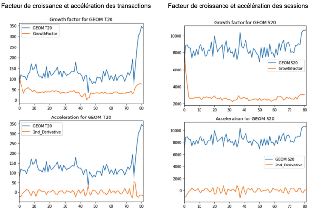 En observant le facteur de croissance et la dérivée seconde des transactions et des sessions, la présence d’un changement anormal se confirme. De plus, on arrive à prédire avec circonspection que la croissance soudaine se stabilise en fin de période, mais reste anormalement élevée, spécifiquement au niveau des transactions.
