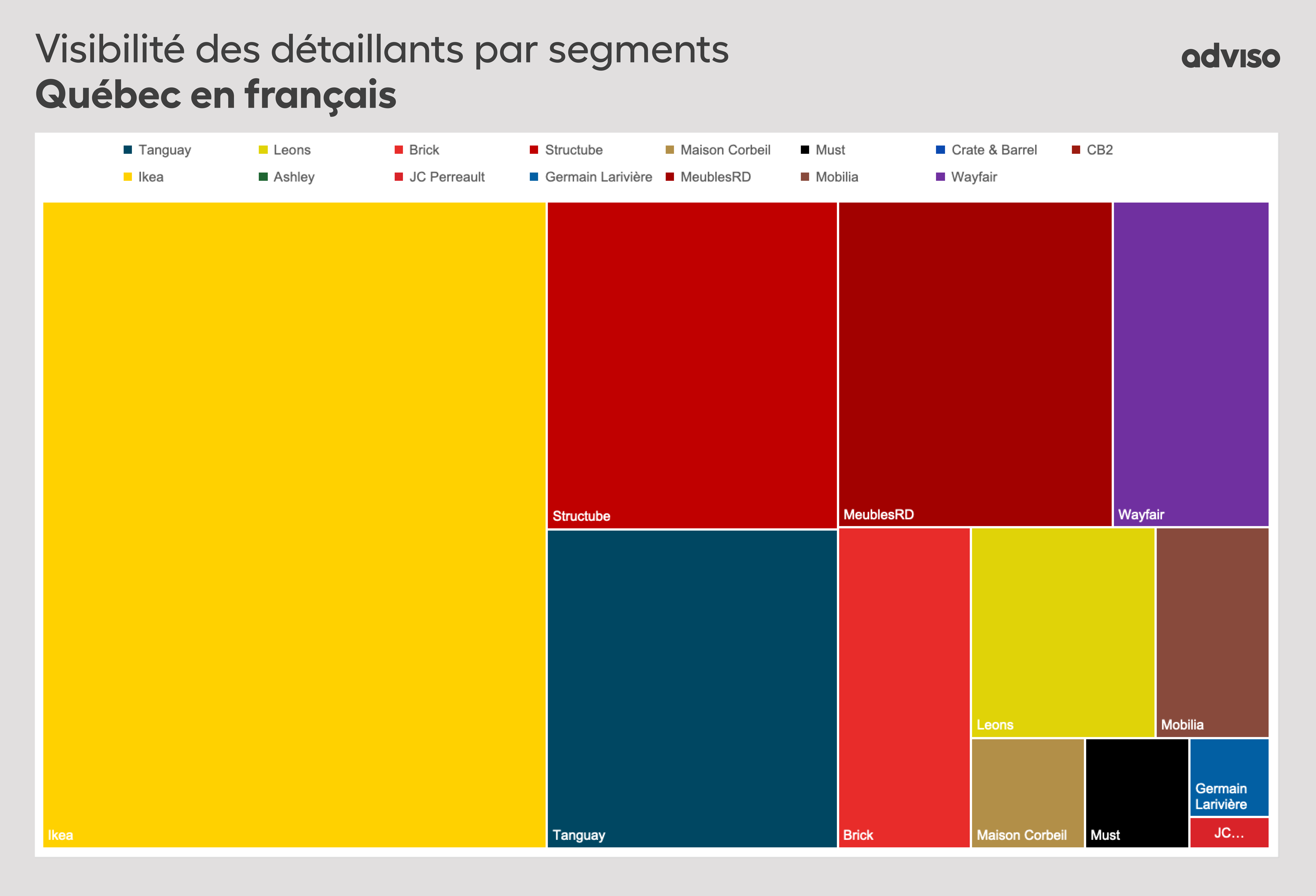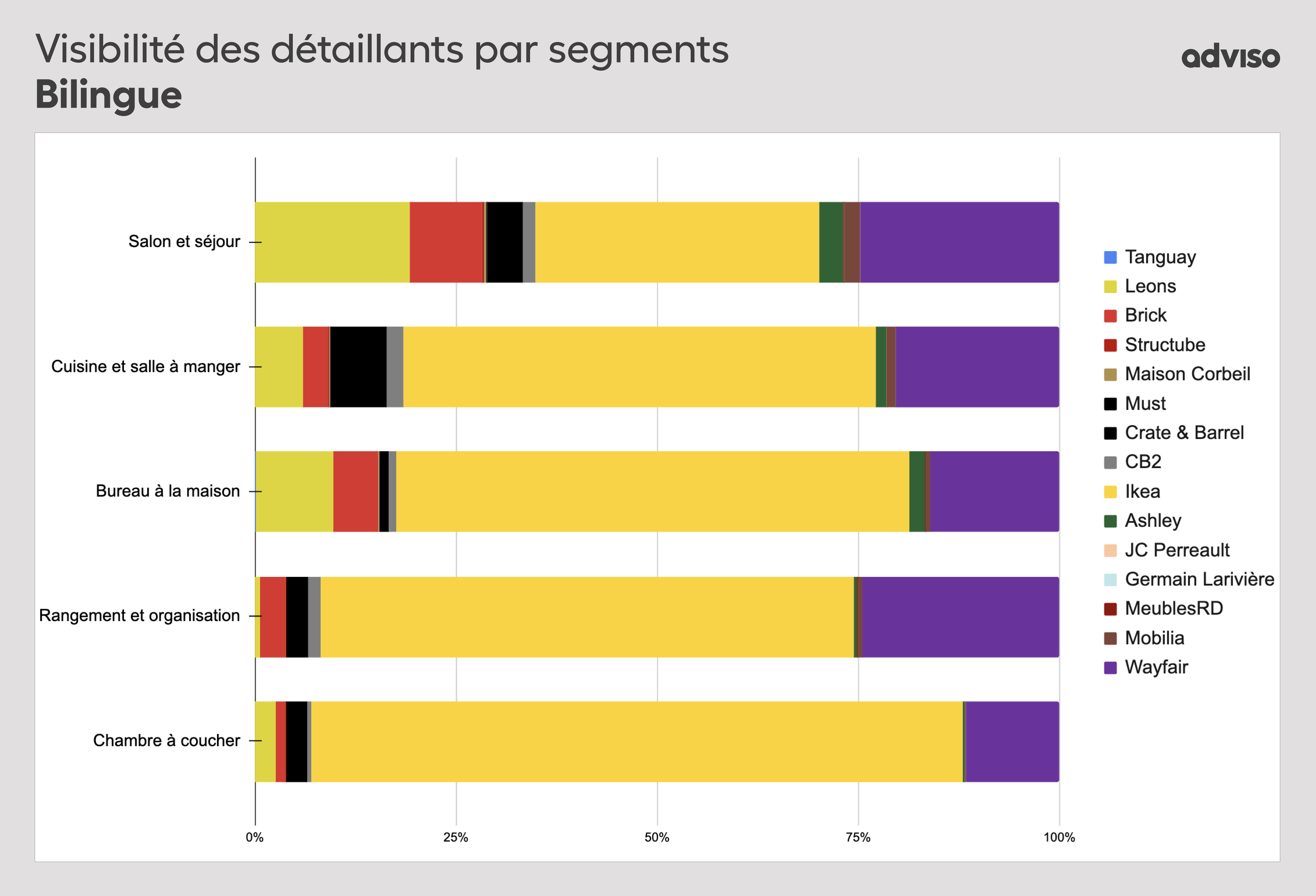 Adviso, firme d’experts conseil en stratégie et marketing numérique, a choisi d’analyser la visibilité des différents détaillants de meubles canadiens dans cette étape cruciale du parcours d’achat. Peu importe qu’ils achètent en ligne ou en magasin, les consommateurs canadiens et québécois font des recherches en ligne avant d’acheter leurs meubles, car ce sont des produits à forte implication.