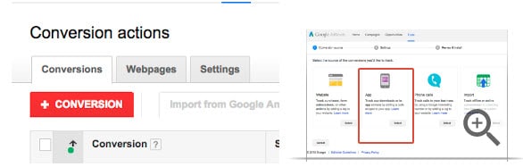 Source : https://support.google.com/adwords/answer/6255257?rd=1 - Cliquez sur le bouton +Conversion et sélectionnez l’option «Application»