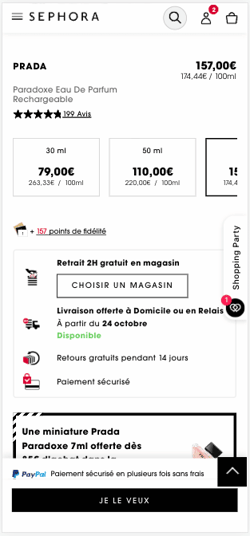Des messages visant la rassurance, liés à la livraison rapide, au paiement sécurisé (Paypal) et aux retours gratuits, sont visibles sous le CTA « Je le veux », affiché en tout temps sur les fiches des produits présentés sur le site web de Sephora.