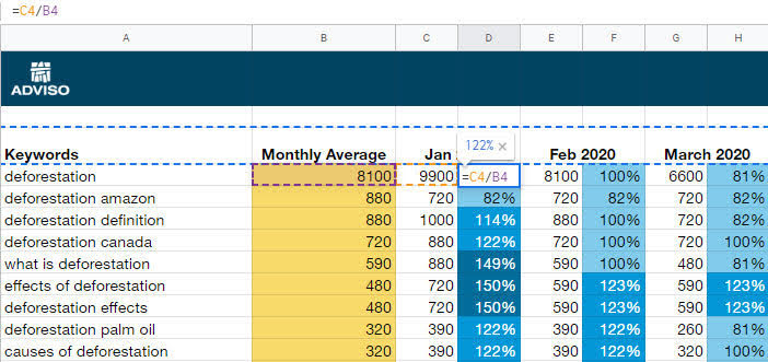 4 – Ensuite, entrez une formule simple dans les colonnes à droite de chaque mois pour montrer comment le volume mensuel se compare à la moyenne annuelle, et vous avez terminé ! Vous pouvez également ajouter un code couleur afin d'identifier visuellement les opportunités de contenu pour chaque mois.
