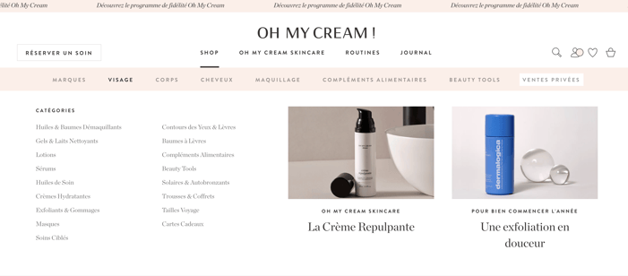 Sur Oh My Cream, l’offre produit est bien organisée, alliant à merveille clarté et exhaustivité. Des produits mis en valeur sont également présentés dans le menu de navigation pour rediriger la clientèle vers le produit.