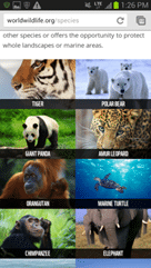 Le seul menu présent est le menu principal. L’utilisateur doit ensuite naviguer dans les pages de catégorie (exemple ci-dessus : la page des espèces) pour voir les sous-catégories (dans le cas présent une sous-catégorie = une espèce).