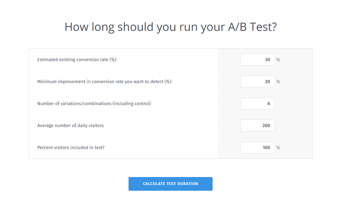 Cette période d’attente est un coût propre aux tests d’optimisation. En effet, pour atteindre une confiance statistique, un test doit être en ligne et vu par un certain nombre de visiteurs afin d’en tirer des conclusions pertinentes. Avec les mesures présentées ci-haut en votre possession, il est possible de calculer la durée potentielle de votre test à l’aide d’une «Sample Size Calculator» (suivre le lien vers la calculatrice de Visual Website Optimizer.)