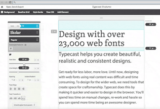 Cependant, des outils qui permettent de designer en format natif (HTML/CSS) sans effectuer de codage commencent à apparaître. Le plus avancé est probablement TypeCast. Cet outil permet de concevoir des designs de page directement dans son navigateur, avec cinq sources de polices de caractères Web branchées sur l’application, donc des milliers de possibilités. Une fois le design terminé, un guide de style Web est généré automatiquement, en plus du code source correspondant à ce design.