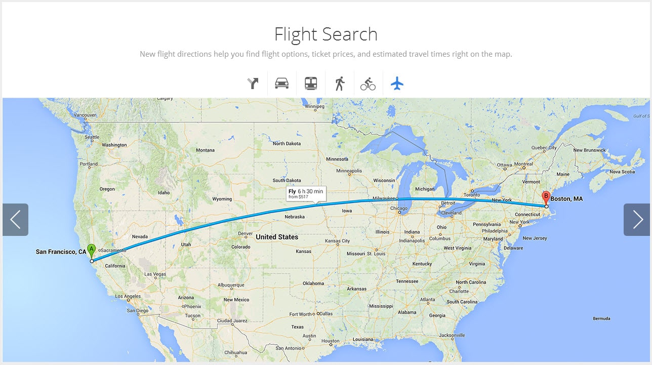 - un itinéraire de voyage multi-modal (États-Unis seulement pour l’instant) permettant de voir le trajet et le temps nécessaire pour se rendre du point A au point B à l’aide de moyens de transports différents (ex. : avion et train, avion et traversier, etc.) [youtube]https://www.youtube.com/watch?v=THxJHcR1D2c[/youtube]