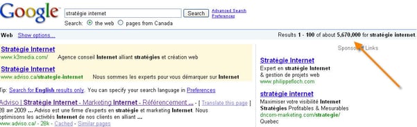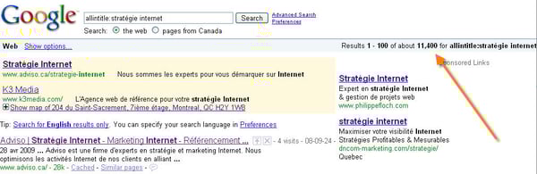 Le deuxième facteur expliquant la compétitivité d’un mot clé se résume souvent à des facteurs monétaires : plus il y a d’argent à faire avec un mot clé, plus de sites seront optimisés pour ce dernier et plus il sera difficile pour un nouvel entrant de se positionner correctement. Ce deuxième type de compétition est aussi facile à déterminer en utilisant la commande allintitle dans Google. Cette commande permet de savoir combien de sites possèdent le mot clé dans la balise TITLE, l’élément le plus important en SEO. Il est certain que l’ensemble des sites possédant un mot clé dans leur balise TITLE n’ont pas nécessairement une intention SEO, mais c’est un bon point de départ pour estimer le nombre de sites qui ont fait des efforts minimums. C’est la donnée de compétition pour les mots clés la plus fiable à mon avis, et de celle d’une bonne partie de la communauté SEO. Il existe beaucoup d’autres outils permettant d’estimer la compétition pour un mot clé, mais ceux-ci sont généralement basés sur les deux facteurs cités ci-dessus.