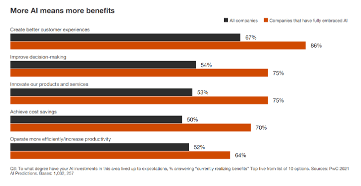 Une étude récente, menée par PwC et reprise par AiThority, montre à quel point les entreprises pleinement investies en IA en tirent un bien plus grand bénéfice que celles qui ne s’y investissent qu’à moitié. Elle arrive également à la conclusion que l’expérience client est le domaine qui profite le plus de l’intégration de l’IA au marketing relationnel.