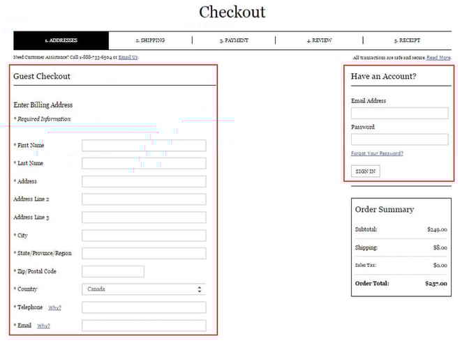 Je sais que vous désirez encourager un maximum d’utilisateurs à devenir membre de votre site, mais faites attention de ne pas interrompre la progression logique du processus de checkout. Lorsque les utilisateurs sélectionnent « Passer à la caisse », ils souhaitent procéder directement au paiement. S’ils se font alors présenter un formulaire à remplir pour la création d’un compte membre, ils perçoivent cette action comme une condition à l’achat. Souhaitez-vous réellement communiquer que seuls les membres du site peuvent effectuer des achats?