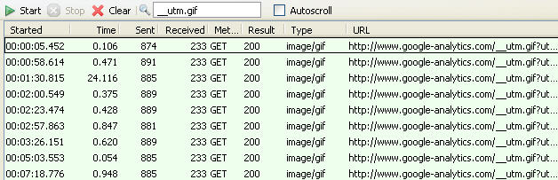 De mon arrivée sur le site jusqu’à la disparition de la dernière fenêtre de Firefox, on compte neuf « hits » au fichier « __utm.gif » par lequel sont envoyées les données qui vont alimenter les rapports de Google Analytics une fois compilés. J’ai pris un malin plaisir à les décortiquer un à un, et voilà ce qui a retenu mon attention (regroupé en une seule image pour chacun des hits) :