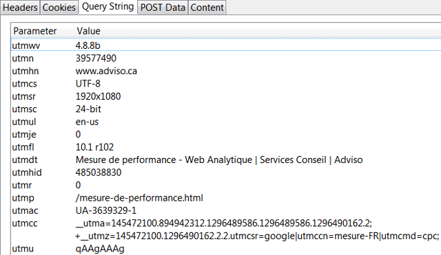Au quotidien, et plus concrètement, Httpfox nous permet de visualiser très rapidement quelles sont les données envoyées aux serveurs de Google Analytics lors du « hit » au fichier « __utm.gif » par lequel transitent toutes les informations qui se retrouvent par la suite compilées dans les rapports. Chacun des paramètres de la requête est décortiqué et présenté de façon intelligible, ce qui nous permet de valider l’implantation et de détecter d’éventuelles erreurs.