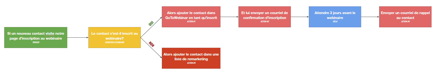 Les déclencheurs peuvent être : la soumission d’un formulaire, la visite d’une page, une interaction avec un courriel, un ajout au panier, un changement de statut manuel, etc.