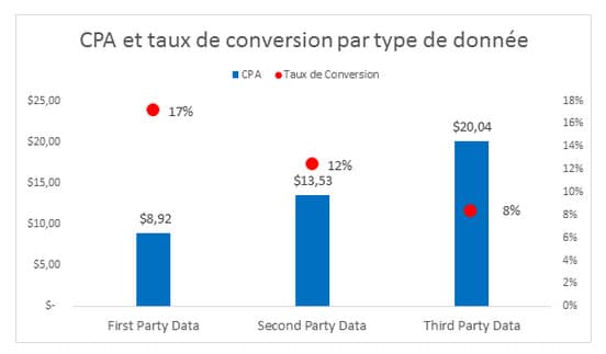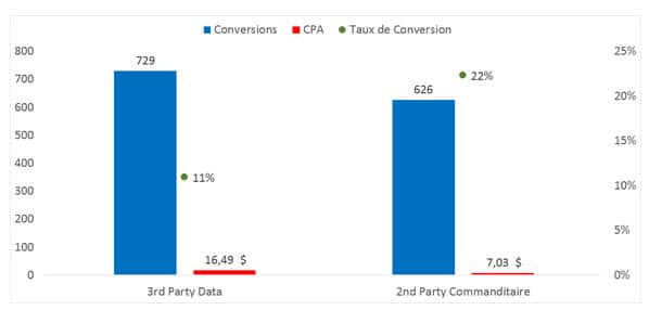 L’audience 2nd Party a généré une centaine de conversions de moins que notre audience 3rd Party Data. Cependant, le taux de conversion était deux fois plus élevé sur l’audience 2nd Party et il a généré un CPA de 57 % plus bas que l’audience 3rd Party Data.