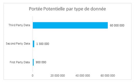 Par défaut, le 3rd Party Data est le type d’audience offrant la plus grande portée potentielle. Ce type de data vous permet donc de rejoindre de futurs nouveaux clients. Comme ces segments d’audience sont composés d’utilisateurs provenant de multiples sources, leur taille sera conséquemment beaucoup plus grande. Les audiences 3rd Party les plus génériques peuvent contenir des centaines de millions d’uniques. La qualification de l’audience sera toutefois inévitablement plus faible, car une certaine proportion du bassin ne répondra pas aux critères définissant votre cible (âge, marché, revenu, etc.).