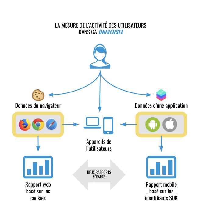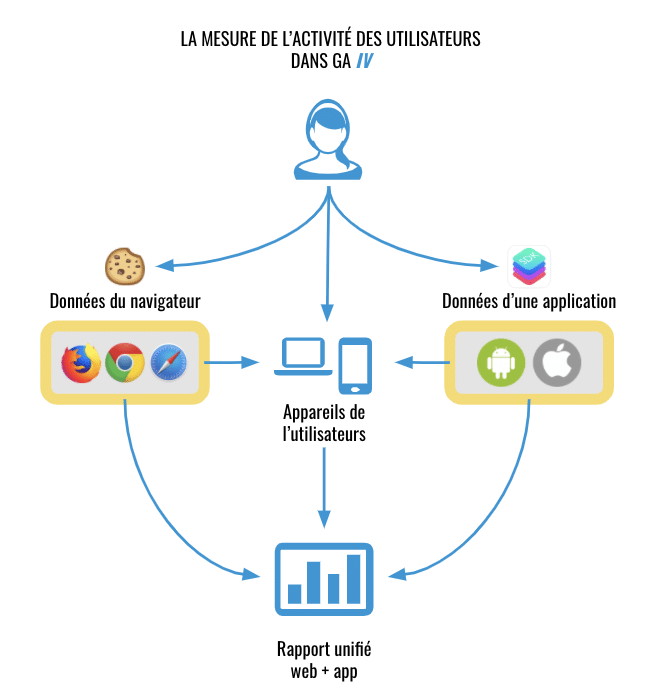 GA4 n’est pas en mesure de mitiger à elle seule les impacts de l’apocalypse des cookies. Toutefois, la plateforme a été conçue pour mieux combler les écarts et les disparités de mesure causés par la disparition des cookies tierces et des identifiants publicitaires (IDFA). Selon Russell Ketchum, directeur de la gestion de produits (Group Product Manager) chez Google Analytics, la nouvelle version utilisera de plus en plus l’apprentissage automatique pour pallier les écarts de données entraînés par l’éventuelle disparition des cookies et des IDFA. D’ailleurs, c’est en partie grâce à l’unification de la donnée mobile et web offerte par GA4 que s’ouvrira cette nouvelle possibilité.