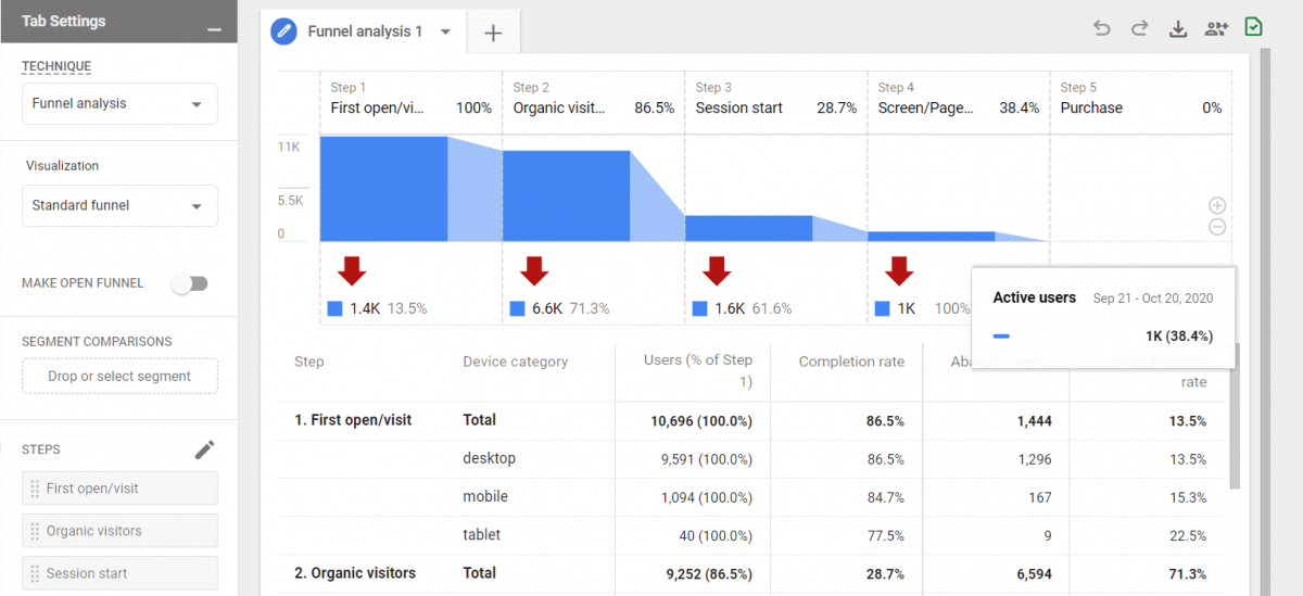 L’un des aspects les plus intéressants de GA4, c’est la manière dont les analyses de l’entonnoir ont été repensées et transformées. Avec la version actuelle, l’analyse de l’entonnoir est très limitée et laisse très peu de place à des rapports personnalisés. Dans la toute dernière mouture, ces rapports se rapprochent du niveau de GA 360, la version payante de Google Analytics. En effet, il est possible de concevoir un entonnoir sur mesure du parcours client beaucoup plus adapté à votre réalité d’affaires.