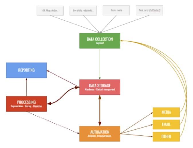 Toutes ces “fonctionnalités” sont généralement rassemblées dans un seul outil par les gros acteurs de l’industrie (Marketo, Eloqua, Hubspot…), mais on pourrait aussi concevoir un marketing stack composé d’outils remplissant chacun une fonctionnalité précise (ce qui donne plus de flexibilité et la possibilité de tester de nouveaux outils mieux adaptés à sa réalité du moment).