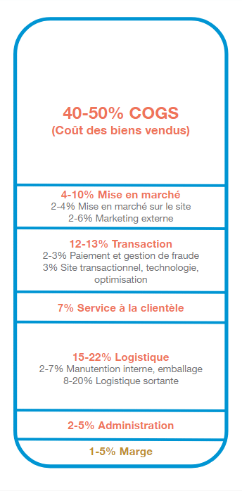 coûts. Pour ce faire, nous proposons d’analyser quelles proportions, pour chaque dollar dépensé en numérique, sont possibles d’associer à différents types de coûts comme le COGS, la mise en marché, la transaction, le service à la clientèle, la logistique ou encore les frais administratifs. Cette analyse permet non seulement de mieux connaître la marge, mais aussi de voir où se trouvent les plus grandes sources de dépenses.