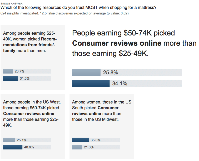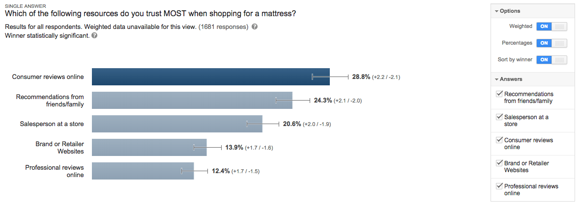 Le plus accessible de ces outils est certainement Google Consumer Surveys. En quelques clics, on peut choisir une cible démographique, un marché et parmi plusieurs formats de questions qui sont tous personnalisables. Le prix par répondant variera selon la complexité du sondage.