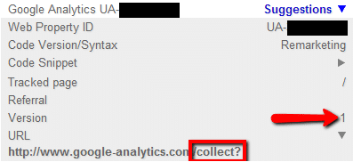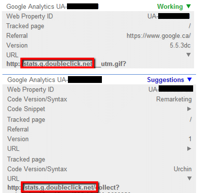 Notez que lorsqu’il s’agit de code Universal Analytics, avec le Remarketing, une autre ligne URL apparaît.