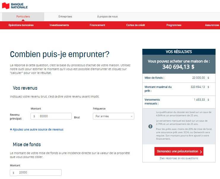 Outil de la Banque Nationale du Canada permettant à un particulier de calculer la capacité d’emprunt, accompagné d’une option de pré-autorisation.