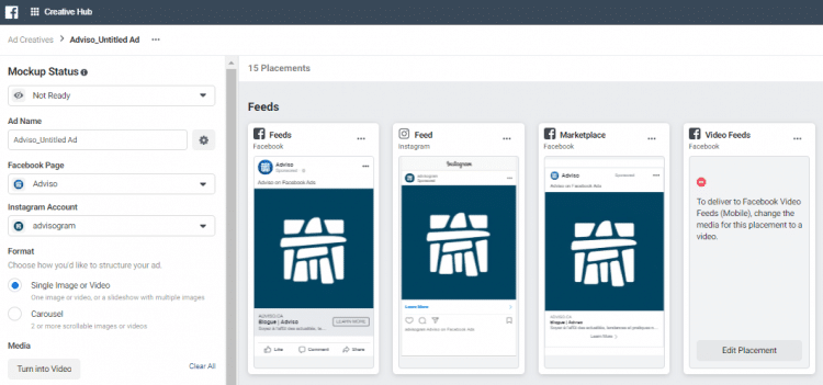Chaque personne ayant accès à un compte publicitaire Facebook peut accéder au Creative Hub et ainsi créer ou consulter des maquettes (mockups). Chaque partie peut alors y aller de son inspiration et émettre des propositions jusqu’à l’atteinte d’une version finale qui sera le créatif utilisé pour la campagne.