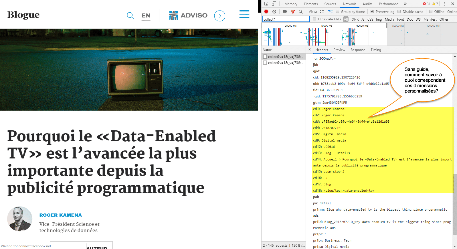 - les éléments qui ne sont pas présents par défaut dans votre outil, comme les dimensions personnalisées de Google Analytics ou les variables de conversion ou les events Adobe Analytics.
