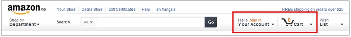 Vos visiteurs doivent comprendre de quelles façons ils peuvent prendre action (acheter, téléphoner, télécharger, etc.) Ainsi, présentez clairement vos appels à l’action et les fonctionnalités de votre site liées au e-commerce. Le panier d’achat, par exemple, doit toujours être visible, même s’il est vide. Le panier d’achat confirme qu’on peut acheter en ligne sur votre site. Regroupez les autres fonctionnalités liées au e-commerce autour du panier d’achat, comme la création d’un compte utilisateur, par exemple (exemple : Amazon) :
