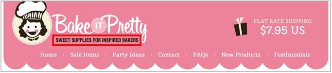 Votre positionnement marketing résume ce que vous offrez et à qui vous le proposez. Parfois, votre nom de marque peut être assez révélateur pour que les internautes devinent votre offre, mais ne prenez jamais rien pour acquis. Ajoutez un court tagline ou une brève description près de votre logo pour expliquer (dans de jolis mots) l’essence même de votre entreprise (exemple : Bake it Pretty) :