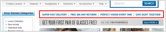 Vos avantages concurrentiels sont les raisons pour lesquelles un client va préférer se procurer ce qu’il cherche chez vous plutôt que chez votre concurrent. On pense ici aux bas prix, à la rapidité de la livraison, à votre politique de retour, à la qualité de vos produits, etc. N’hésitez surtout pas à mettre ces bénéfices de l’avant sur votre page d’accueil. Ils sont rassurant pour le nouvel acheteur et permet aux acheteurs récurrents de confirmer qu’ils font la bonne chose en vous choisissant (exemple : Clearly Contacts) :