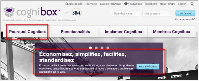 Tout le monde comprend pourquoi il devrait acheter un moule à gâteau ou une chaise, mais la réponse est parfois moins claire lorsque l’on offre des produits spécialisés ou méconnus. Si c’est votre cas, n’oubliez pas de présenter les raisons pour lesquelles il est avantageux d’utiliser votre produit ou votre service. Vous pouvez le faire dans votre carrousel ou en ajoutant un onglet bien visible dans votre menu principal (exemple : Cognibox) :