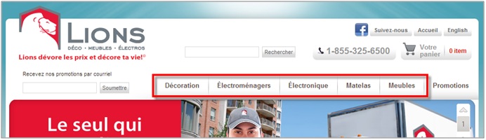 Vous pouvez également présenter les catégories de vos produits directement dans votre menu principal (cette pratique est excellente pour votre SEO). Vos nouveaux visiteurs comprendront mieux votre offre et vos visiteurs fidèles trouveront rapidement ce qu’ils recherchent (exemple : Lions) :