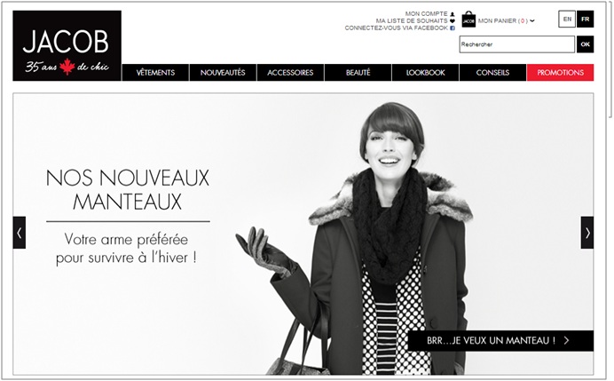 Vos nouveautés et vos promotions sont d’excellents prétextes pour un client amoureux de votre marque d’acheter à nouveau. Alors, mettez-les de l’avant! Pour ce faire, la plupart des sites présentent désormais un carrousel en page d’accueil ou un onglet « promotions » clairement identifié (exemple : Boutique Jacob) :