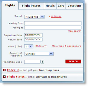 Fig 1 et 2 : de gauche à droite, moteur de recherche de vols d’air canada, moteur de recherche d’hôtels d’expedia.