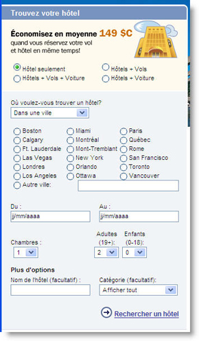 Pour les domaines dans lesquels les données recherchées sont facilement identifiables par des critères spécifiques, il apparait évident qu’une recherche de base constituée d’un seul champ de saisie n’est pas toujours la solution optimale. C’est le cas dans l’industrie du voyage où les recherches d’hôtels ou de billets d’avion nécessitent une interface « avancée » dés les premières étapes de la recherche (voir ci-dessous).