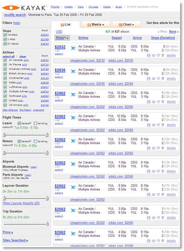 Fig 3 : Page de résultats de Kayak, les filtres sont présentés sur la colonne de gauche et les résultats sont mis à jour sans rafraichissement de la fenêtre.