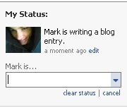 Facebook vient de réintroduire certains statuts d’action selon quelques modèles prédéfinis (feeling, watching, reading, listening to, drinking, eating, playing). Ces statuts peuvent être utilisés en addition du statut courant et des fonctions déjà existantes (identifier d’autres personnes, un endroit et intégrer des photos).