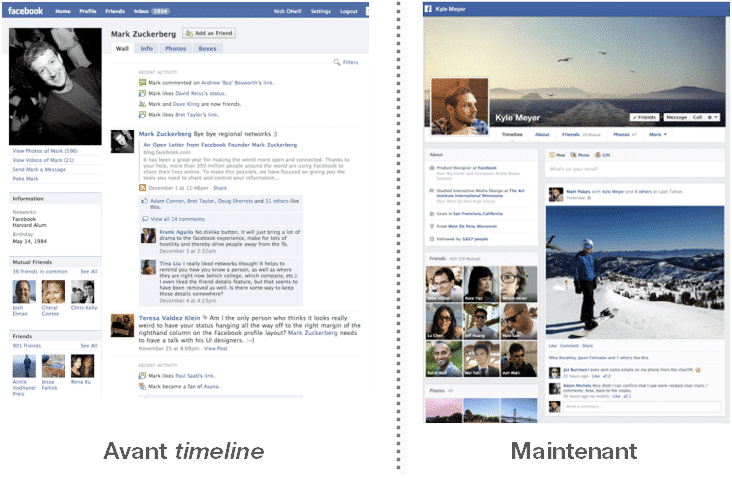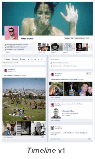 La transition de la page de profil vers la timeline a vu la disposition des divers éléments être centralisée autour de la « ligne de temps » et mis l’accent davantage sur les contenus créés par l’utilisateur en ordre chronologique que sur ceux générés par des applications Facebook ou sur la découverte des intérêts des utilisateurs.