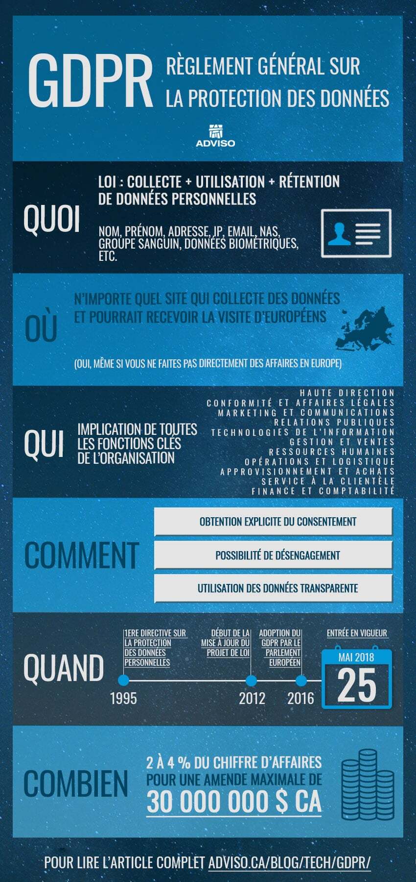 Cet article comporte deux sections : une infographie qui résume en 6 points ce qu’est le GDPR, suivie d’une analyse de fond sur ce que ce cette nouvelle réglementation signifie réellement.