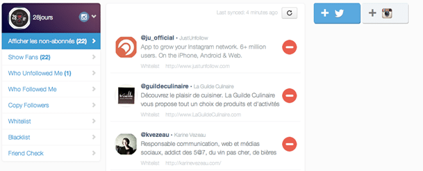 En effet, l’application vous permet de savoir quelles sont les nouvelles personnes qui vous suivent ou ne vous suivent plus. Ou celle que vous suivez mais qui ne souhaite pas vous suivre. Encore plus intéressant, Justunfollow repère les comptes inactifs que vous suivez et vous propose ensuite de les supprimer.