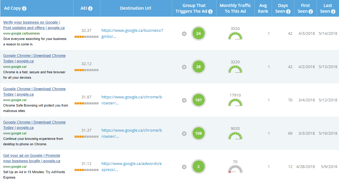 Avec ces informations, il devient facile de jouer avec les annonces de vos compétiteurs pour déterminer quelles formulations répondent le mieux aux besoins de vos utilisateurs et génèrent le plus de visites.