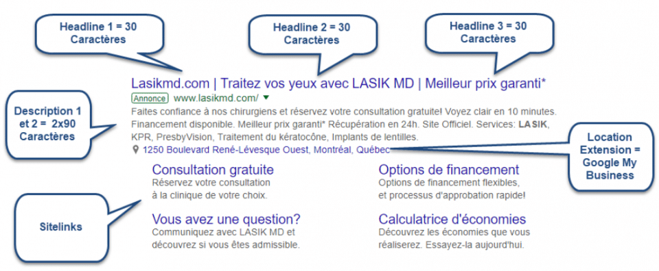 Dans une annonce Adwords, le message le plus important doit se trouver dans les titres (1 et 2) afin d’optimiser la performance et la pertinence. Cependant, la description vous permet de communiquer d’autres informations, en vous offrant 80 caractères supplémentaires de texte.