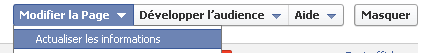 Votre page Facebook doit renseigner les utilisateurs Facebook sur vous. En tant que politicien sur Facebook, il est possible pour vous de donner beaucoup d’informations sur votre passé académique, politique et personnel. Profitez-en pour utiliser cet espace à votre avantage. Pour modifier votre page, il suffit de choisir l’option « Actualiser les informations » de votre panneau d’administration tel que montrer dans l’image ci-dessous :