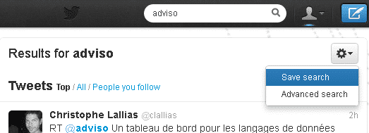 Vous pourriez commencer par effectuer une recherche sur votre nom pour voir les discussions vous concernant. Pour simplifier les recherches futures, Twitter donne la possibilité de sauvegarder celles-ci. Il suffit de cliquer sur la roue dentelée tel qu’indiqué sur l’image pour apercevoir l’option de sauvegarder. Ensuite, pour atteindre les recherches sauvegardées, vous n’aurez qu’à cliquer sur le champ de recherches en haut pour les voir apparaître.