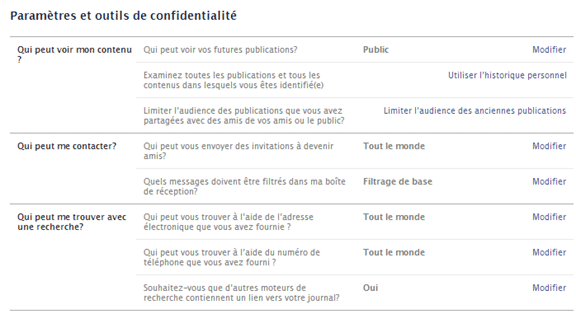 La plupart des informations que je vous présente ici se retrouvent dans la section vie privée de Facebook à l’adresse suivante : https://www.facebook.com/settings?tab=privacy&view