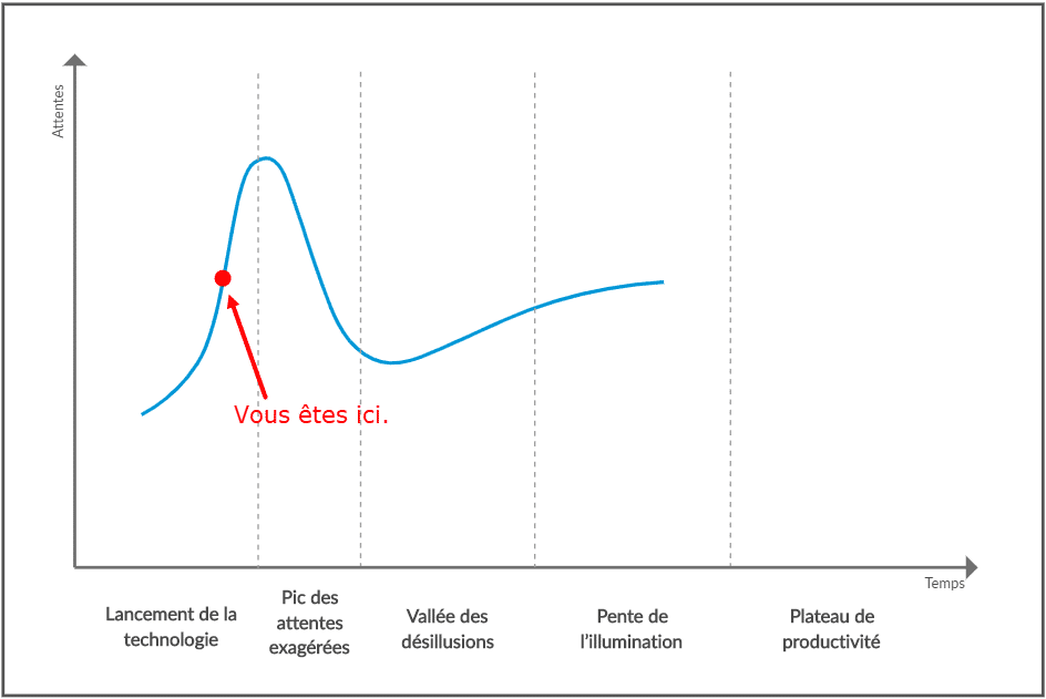 À mon avis, nous sommes actuellement en train de gravir le pic des attentes exagérées. Tous les indices d’un hype y sont présents :