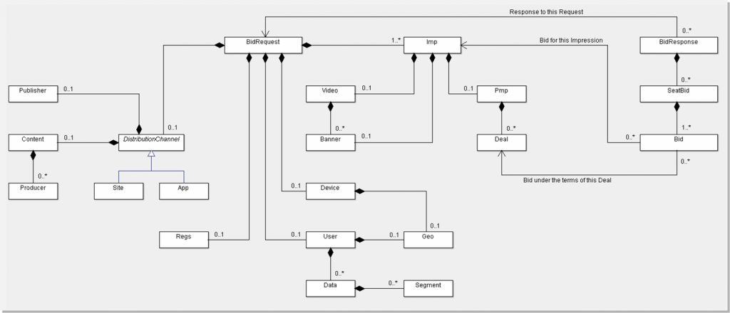 Mais pour vous donner une vue simplifiée de ce qui se passe entre la requête d’une impression mise aux enchères et la juxtaposition d’un segment de data d’audience lors d’une décision prise par le DSP, voici un schéma tiré du protocole OpenRTB 2.1 :