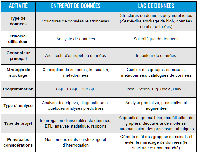 Grille comparative entre les lacs de données et les entrepôts de données