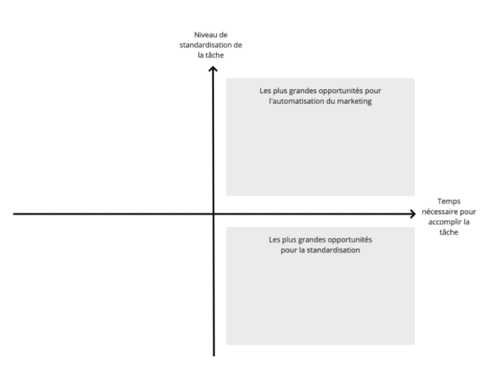 Une fois cela fait, vous serez en mesure de cerner plus clairement vos sources d’irritation (pain points) opérationnelles. Afin d’établir un ordre de priorité quant à leur résolution, vous pouvez les classer dans un plan cartésien présentant le niveau de standardisation de la tâche et le temps nécessaire pour réaliser la tâche. Cela vous aidera à identifier rapidement les opportunités les plus profitables pour l’automatisation marketing.